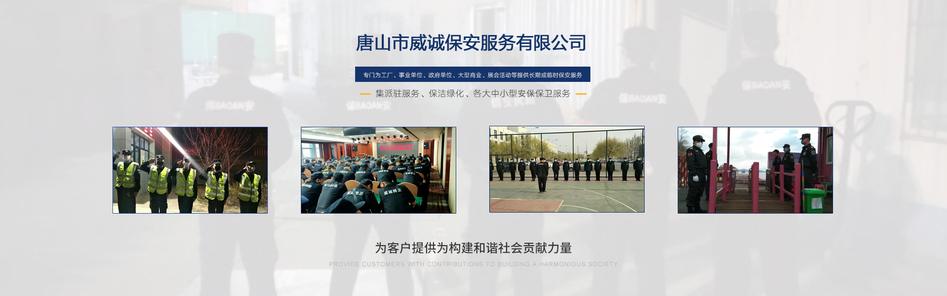 唐山市威誠保安服務有限公司自成立以來以“嚴防死守、忠于業主”為服務原則,以“客戶滿意、 合作共贏”為根本目標。以科學的管理、多方位多層次的服務,建立了首問責任制,完善了走訪、回訪 、滿意度調查、末位淘汰的預警管理,不斷提高服務質量,提高業主滿意度,提高企業形象。秉承“誠 實守信,紀律嚴明,團結協作,致精致誠”的服務理念,為客戶提供高品質、多方位、專業化的保安服務。 本公司制定了嚴謹的定向招生、崗前培訓、考核錄用、崗中培訓、持續(xù)培訓、末位淘汰制等一整套完善的管理體系。可以根據客戶的要求實地勘察評估,以量身定做的方式提供安保防范服務。